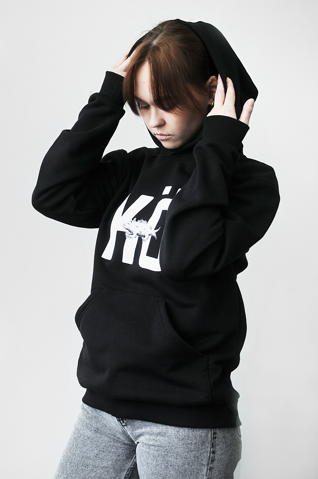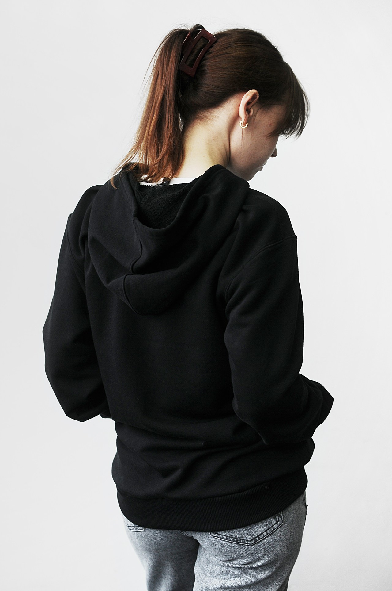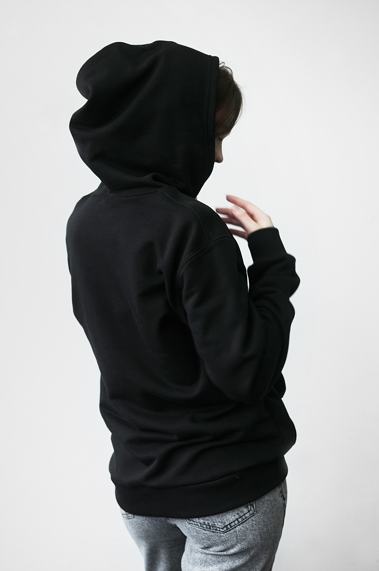 Худи (англ. hoodie от hood — «капюшон») чёрная, размер XL. Худи похожа на толстовку, но, скорее, более сходна с анораком — лёгкой курткой с капюшоном, тоже надеваемой через голову. Как и анорак имеет большие накладные карманы-«кенгурятники» спереди и шнуровку-утяжку на капюшоне. Тёплая худи подходит для прогулок в прохладную погоду, занятий спортом и домашнего времяпровождения.