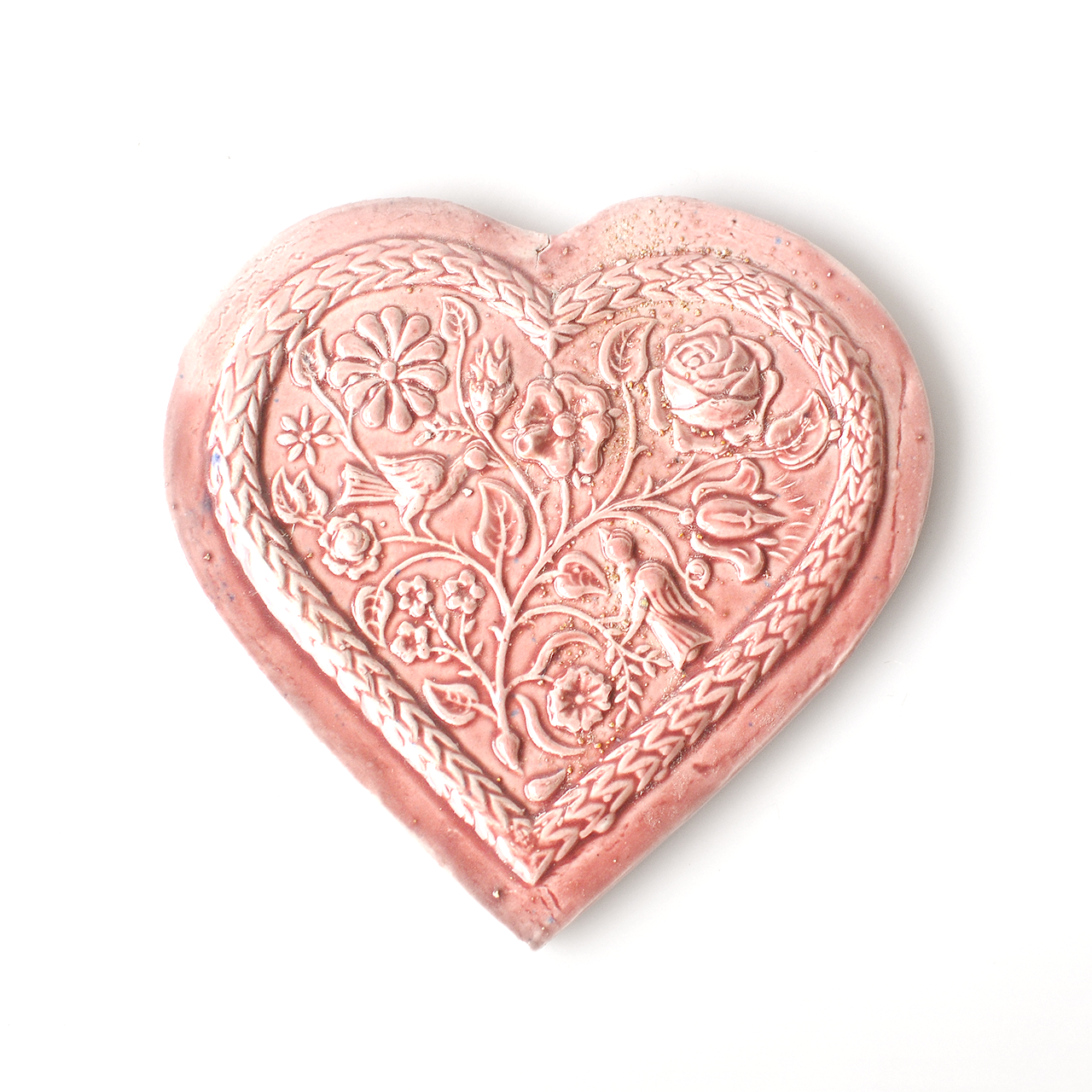 Сердце керамическое, орнамент с парой птиц в цветочном саду.