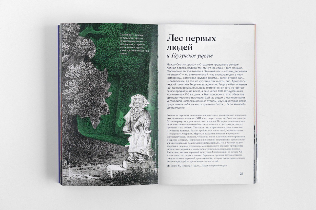 Путеводитель рассказывает истории мест, холмов и руин Самбийского полуострова. Маршрут обходит полуостров два раза: один круг внутренний, по дворцам прусской аристократии и священным холмам древних самбов. Второй, вдоль побережья от Зеленоградска до Балтийска, по небольшим городкам, забытым легендам тёмных лесов и оврагов (и отдельно даже по геологии обрывистых берегов и истории добычи янтаря), замкам и городам исчезнувшим во времени, по огням маяков — вплоть до ангаров Балтийской косы.
