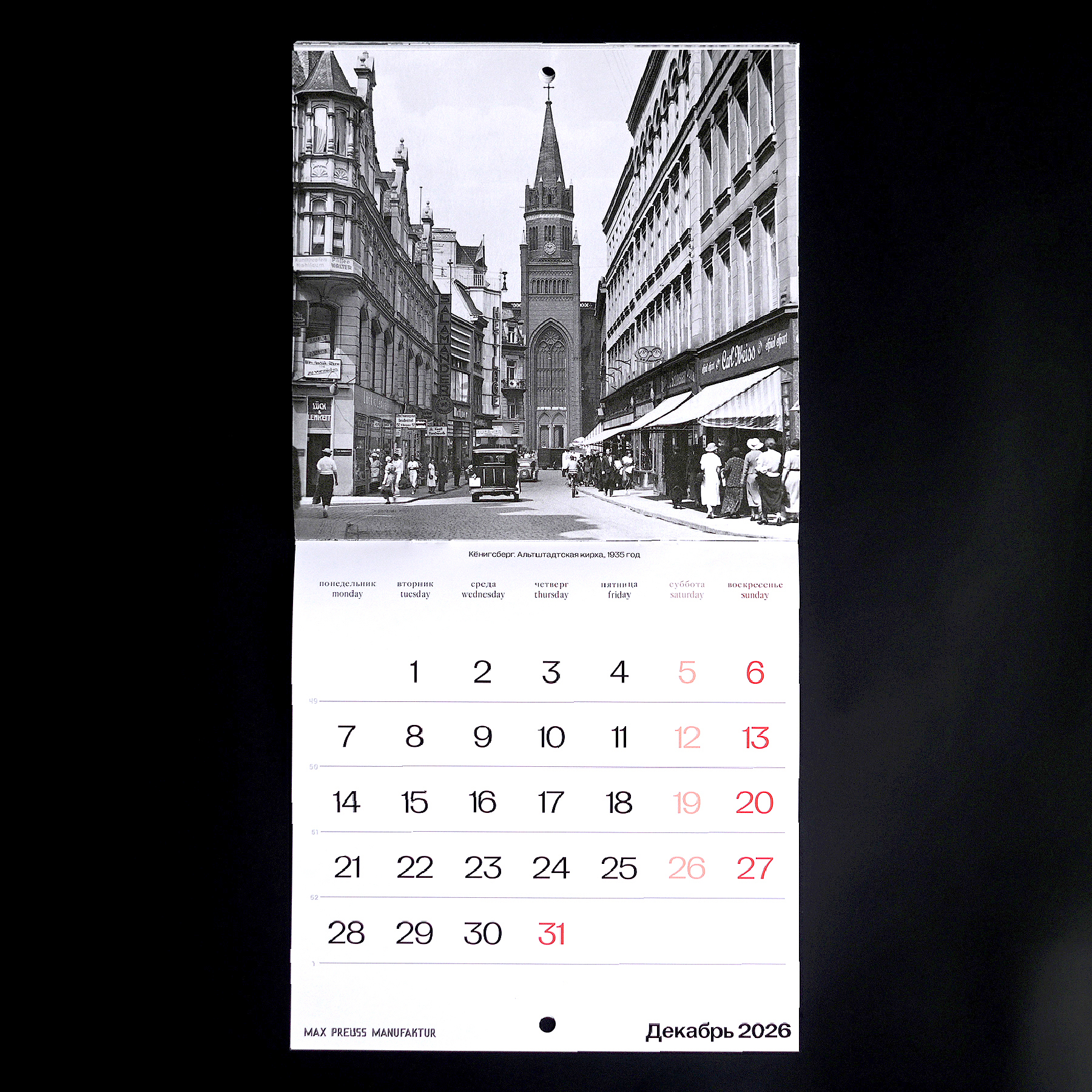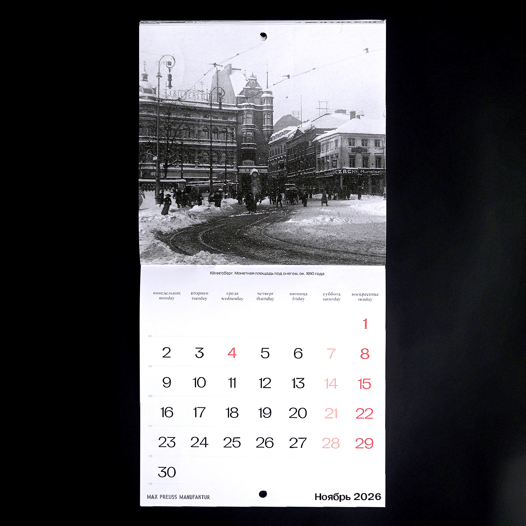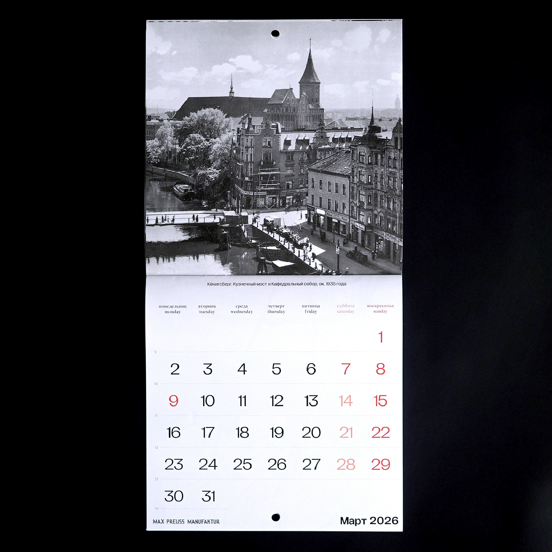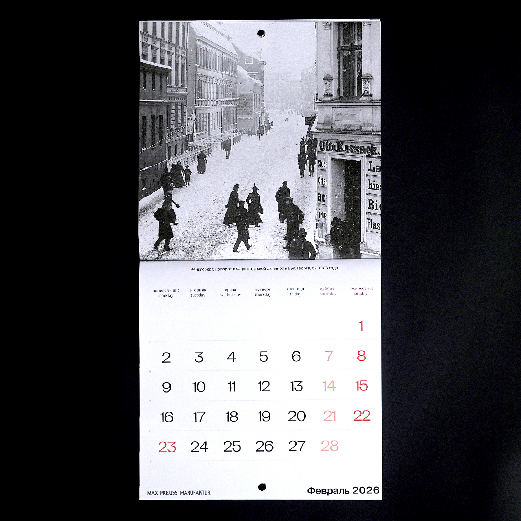 Календарь с архивными фотографиями Кенигсберга начала XX века. На страницах — городские виды и детали, передающие атмосферу того времени.