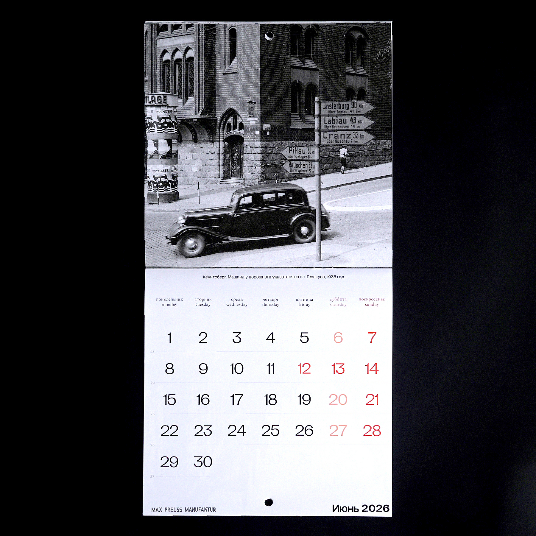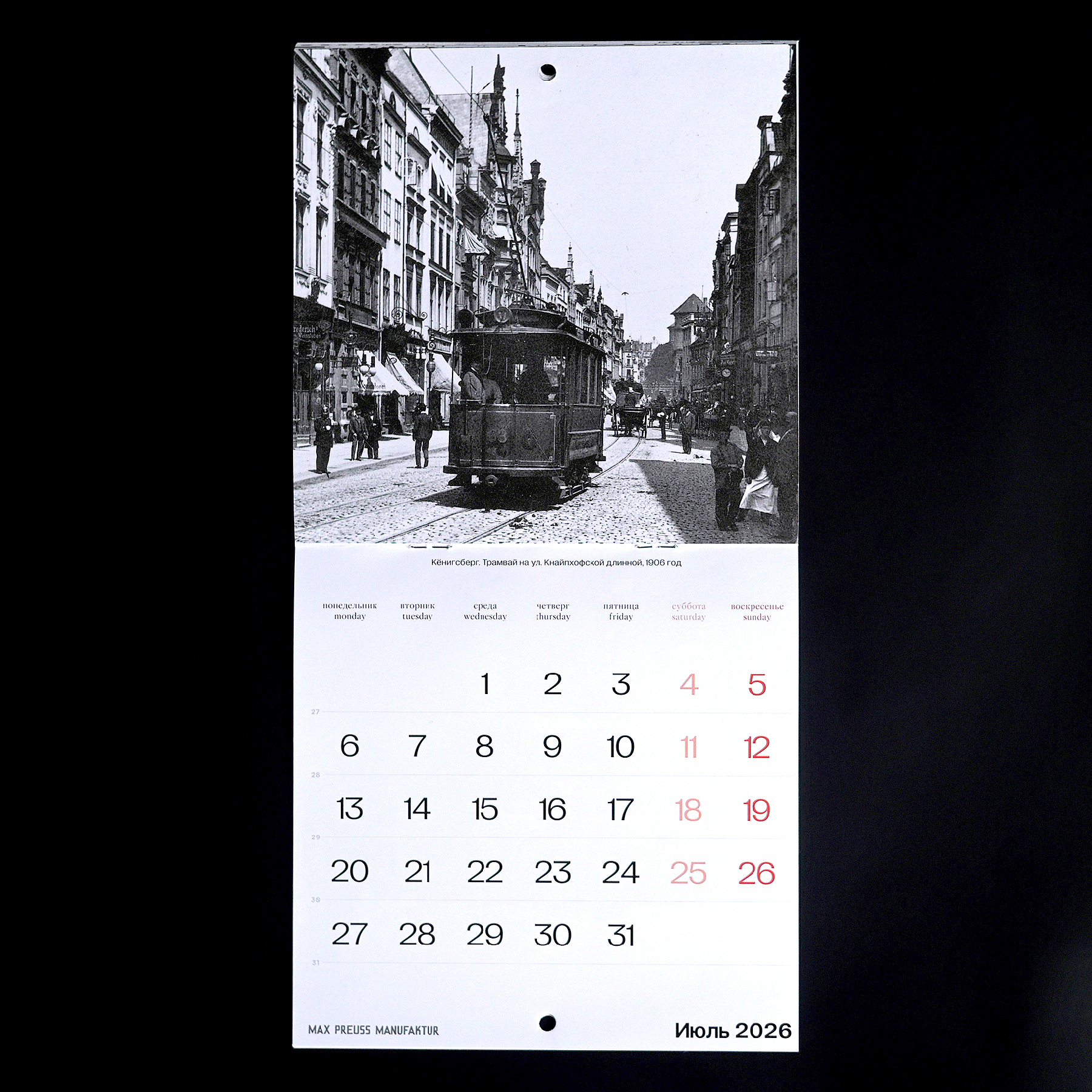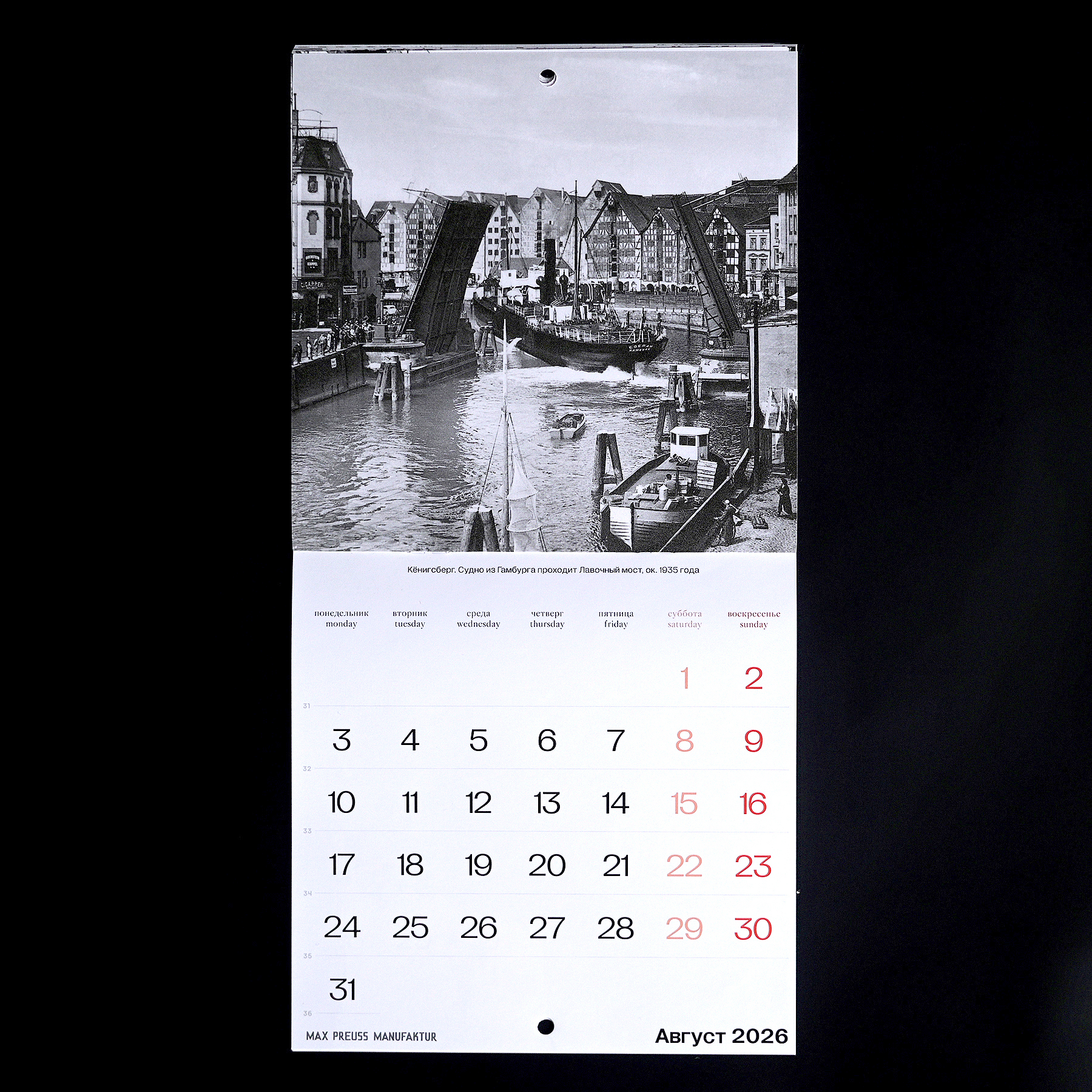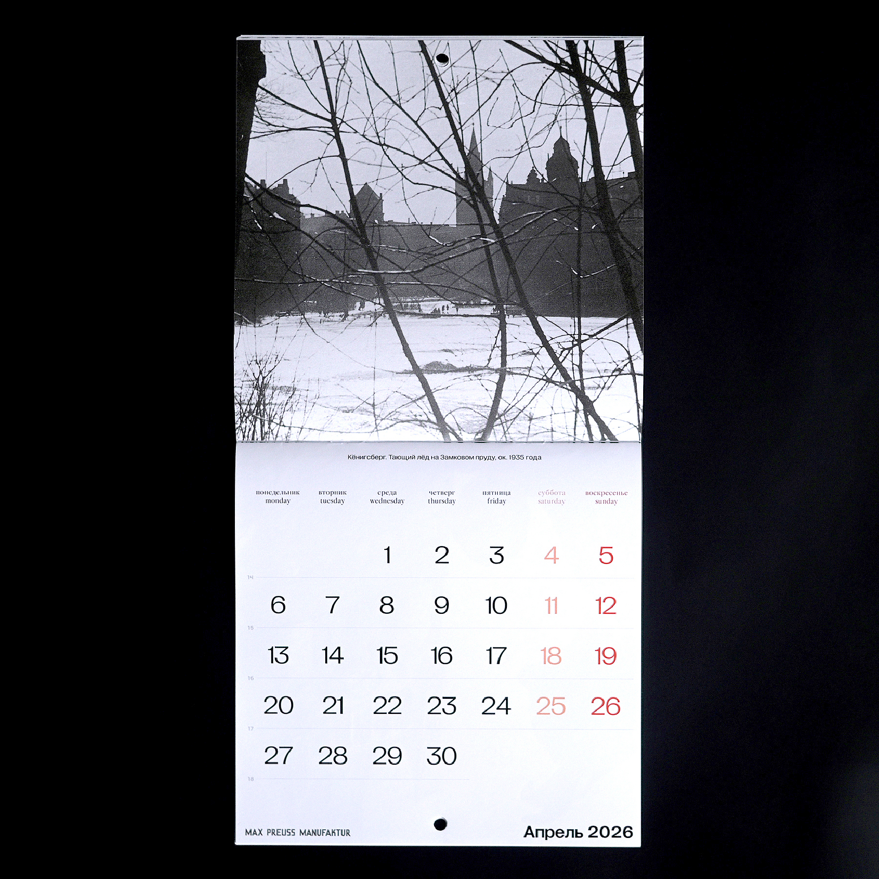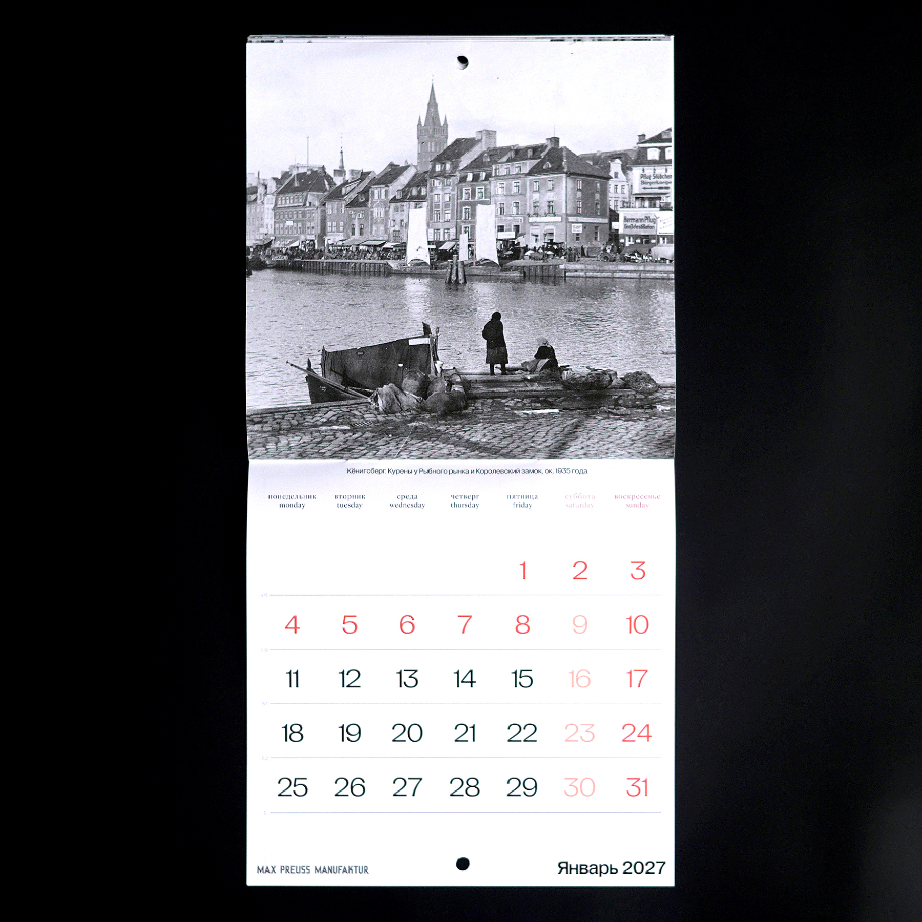 Календарь с архивными фотографиями Кенигсберга начала XX века. На страницах — городские виды и детали, передающие атмосферу того времени.