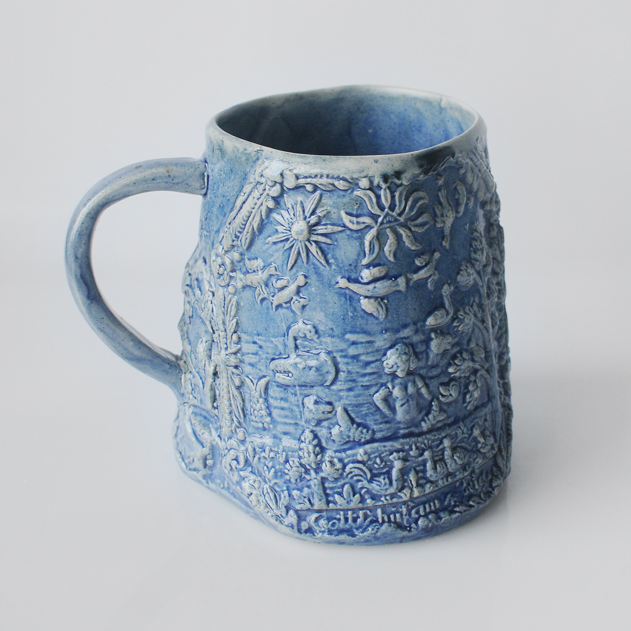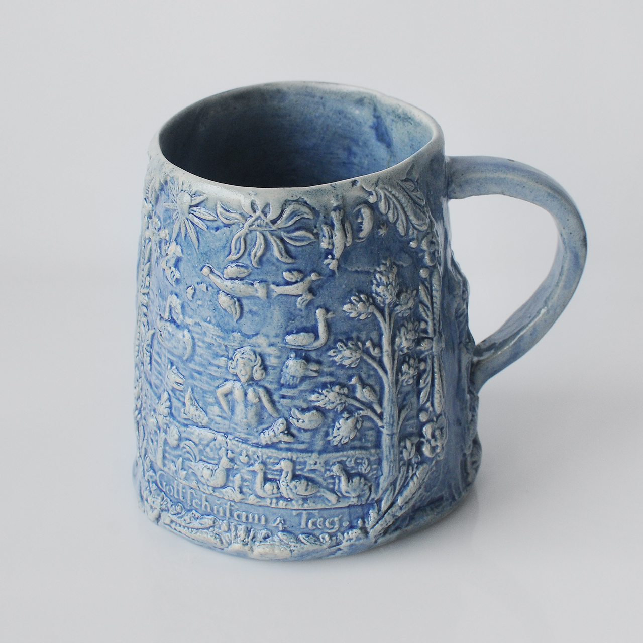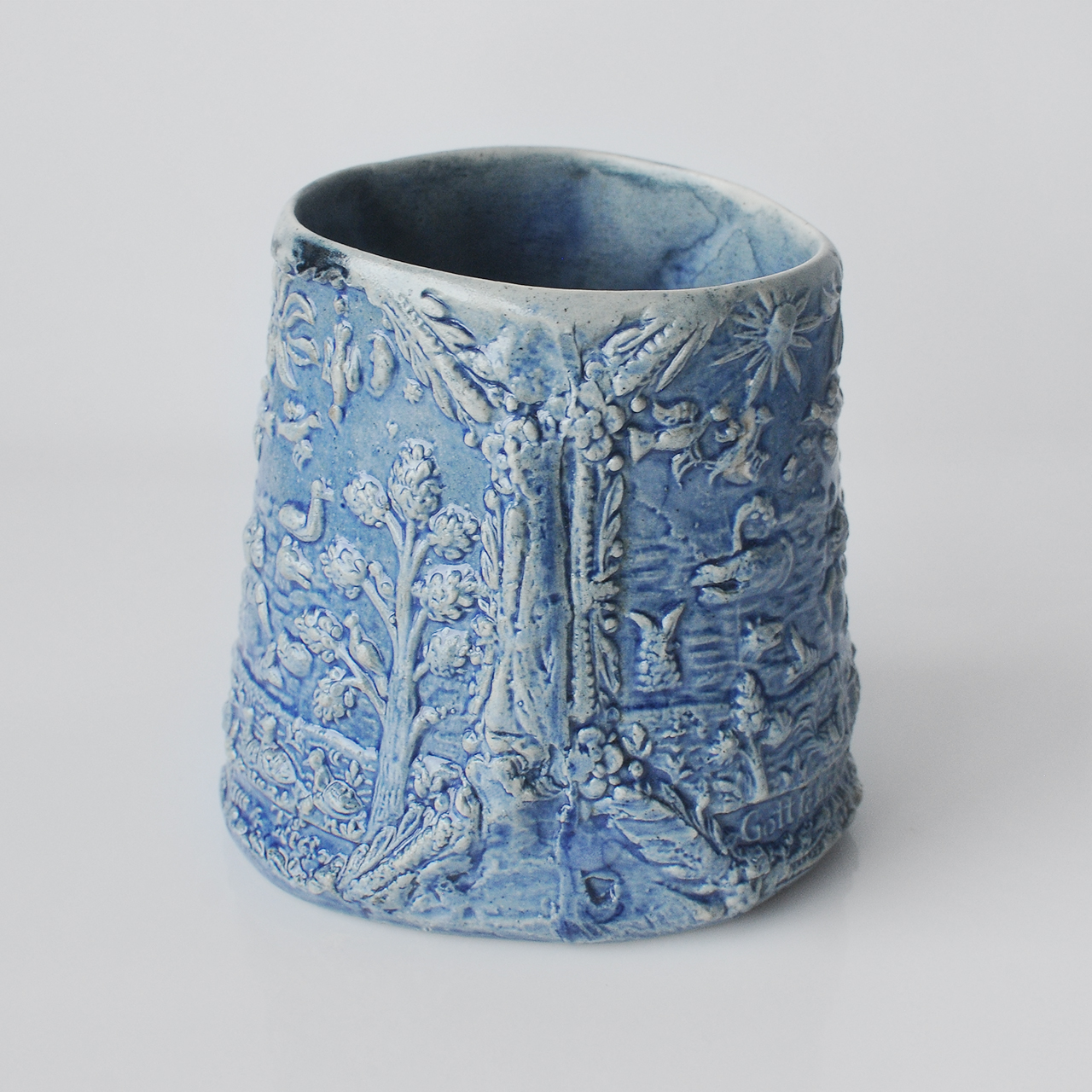 Коллекция «Пряники и сотворение мира» — это керамика, выполненная методом литья по формам с последующей ручной доработкой и глазурованием. Орнаменты на этой коллекции посуды взяты напрямую с марципановых и пряничных форм XVII – XIX веков. Здесь и ганзейские купцы, и Балтийские осетры, и петухи, и сердца, а также купцы на петухах и почтальоны на улитках. Есть и более серьёзные мотивы — семь дней творения, Адам и Ева у Райского дерева со Змеем, фонарщики, мясники, бочкари и каменщики.