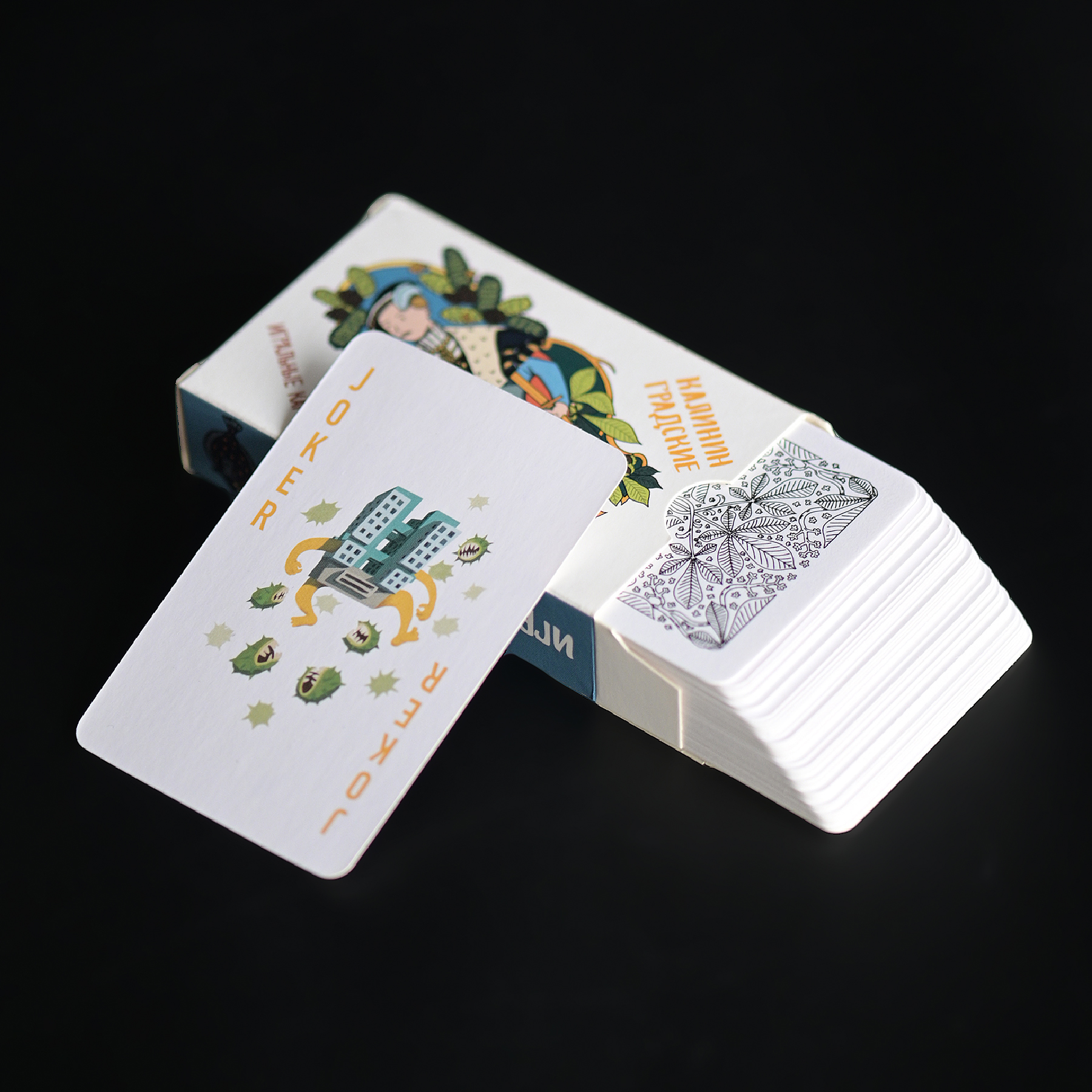 Внутри — колода из 54 карт с джокерами: фигурные карты (валет, дама, король, туз) выполнены с изображениями исторических личностей города; цифровые карты украшены небольшими милыми иллюстрациями, связанными с Калининградом.